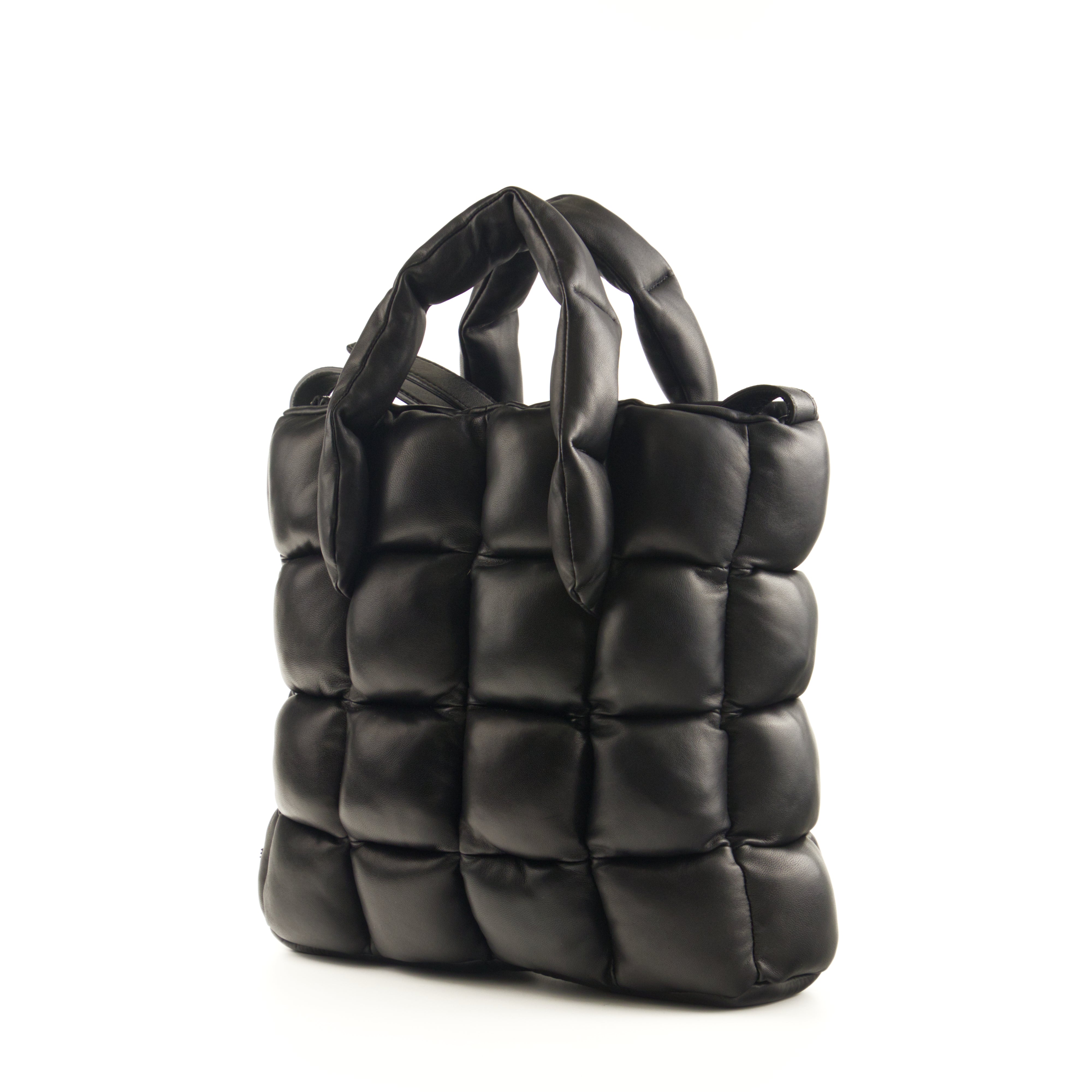 Об'ємна сумка-тоут з м'якої шкіри з квадратною прострочкою. В комплекті шкіряний плечовий ремінь. Підкладка текстиль.